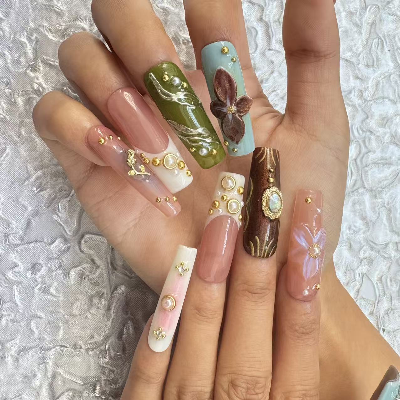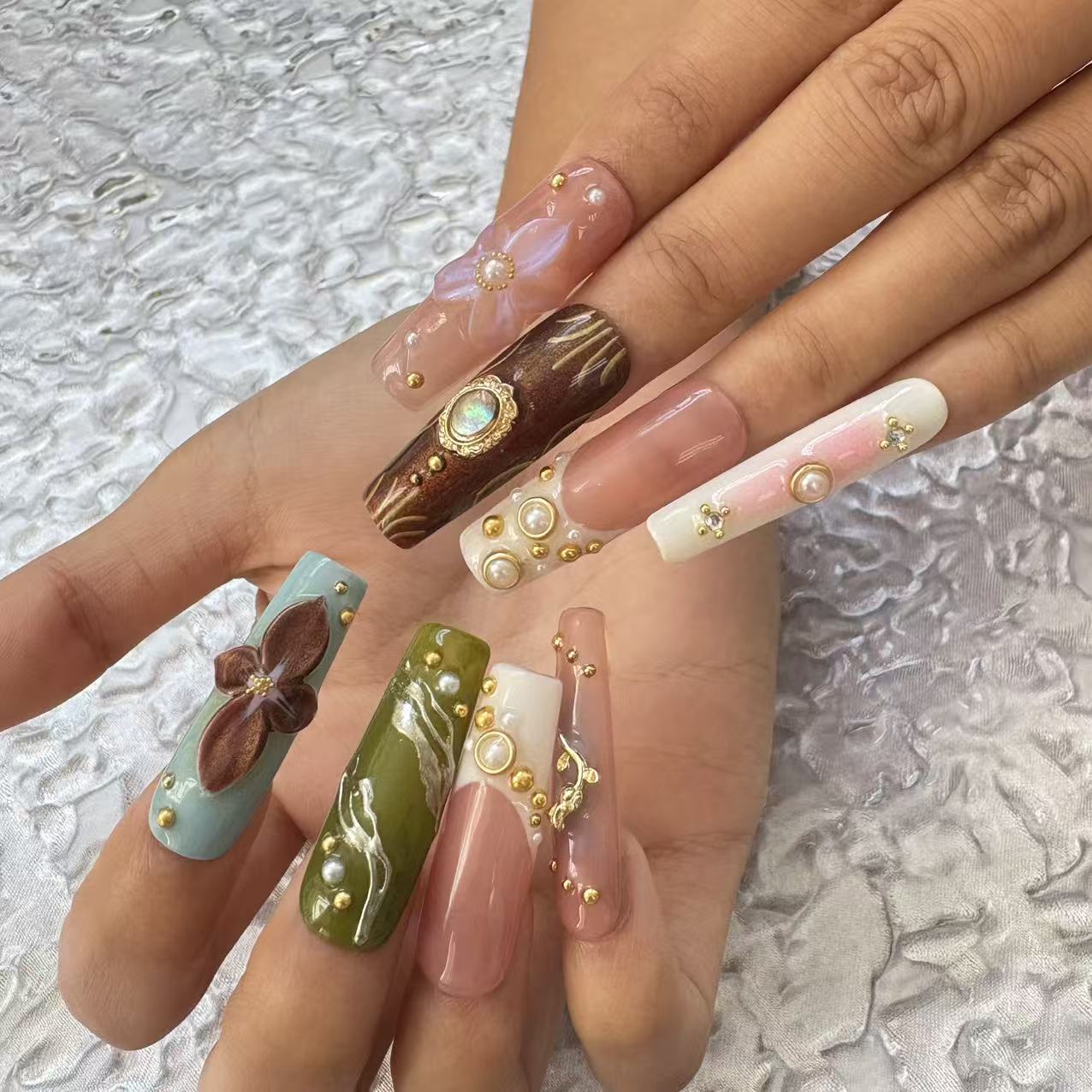 Discover the beauty of our meticulously crafted handmade nail art. These nails feature a harmonious blend of soft nude - pink hues paired with vibrant accents like cool blue, deep green, and rich brown. Adorned with delicate flower decorations, shimmering gemstones, and elegant gold...