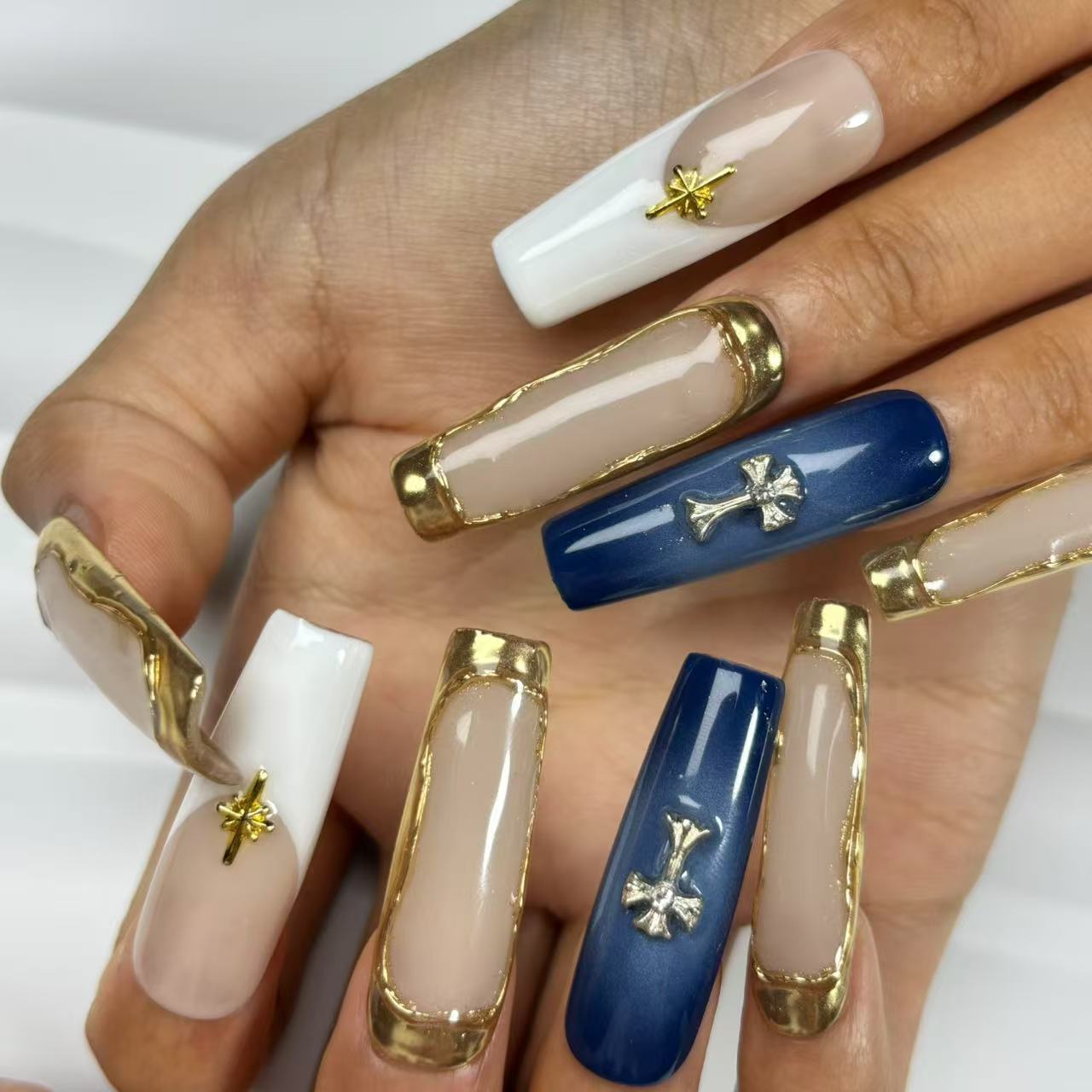 Noble Shade Handmade Nails showcase long, rectangular nails in refined nude - beige, white, and deep blue shades....