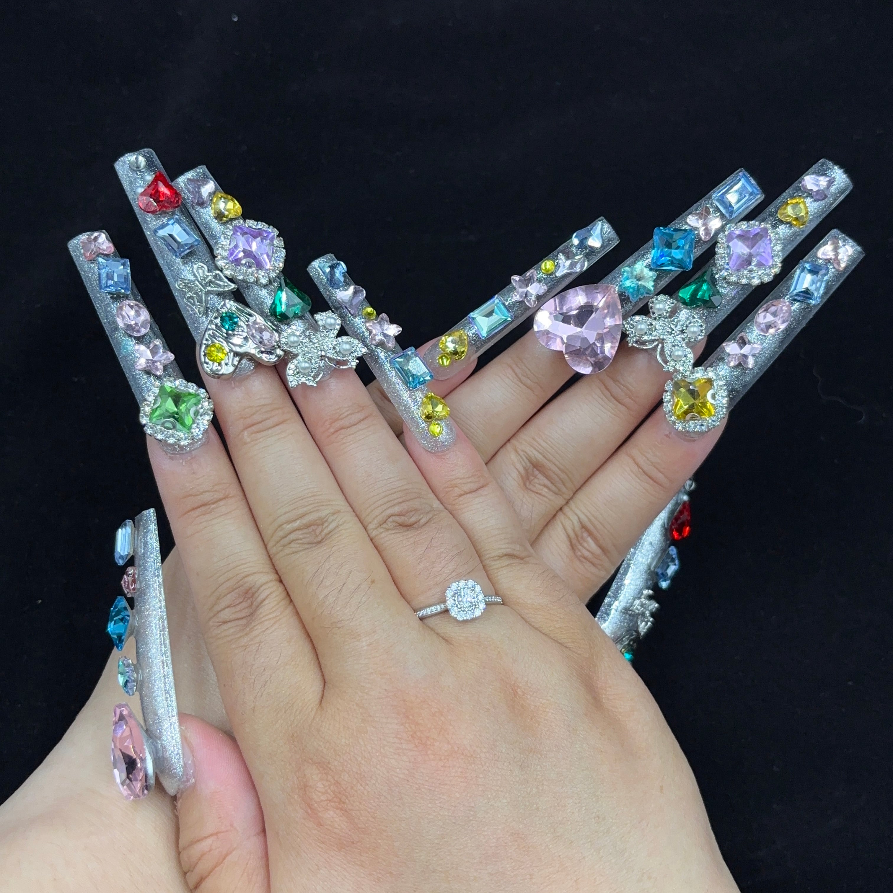 Exquisite Handmade Multicolored Nail Art with Floral and Gemstone Embellishments D051