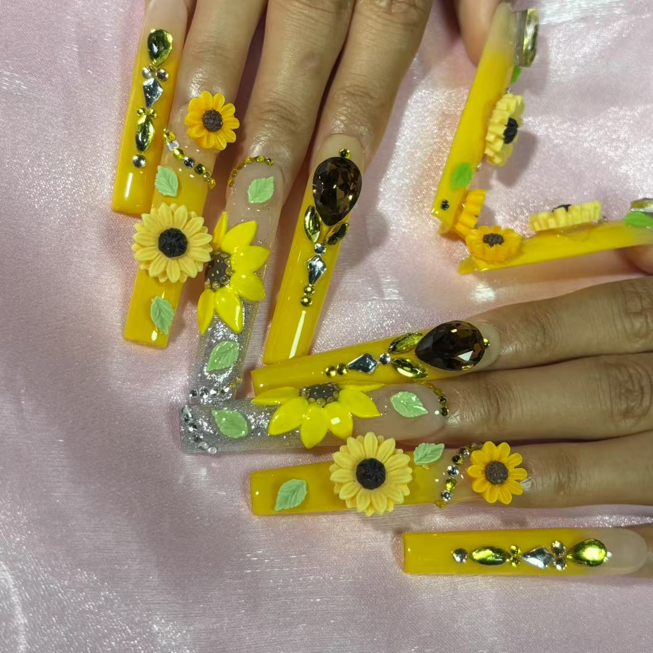 Sunflower Gleam Handmade Nails feature bright yellow bases, 3D sunflower carvings, and amber - gold rhinestones. Fresh, vibrant...